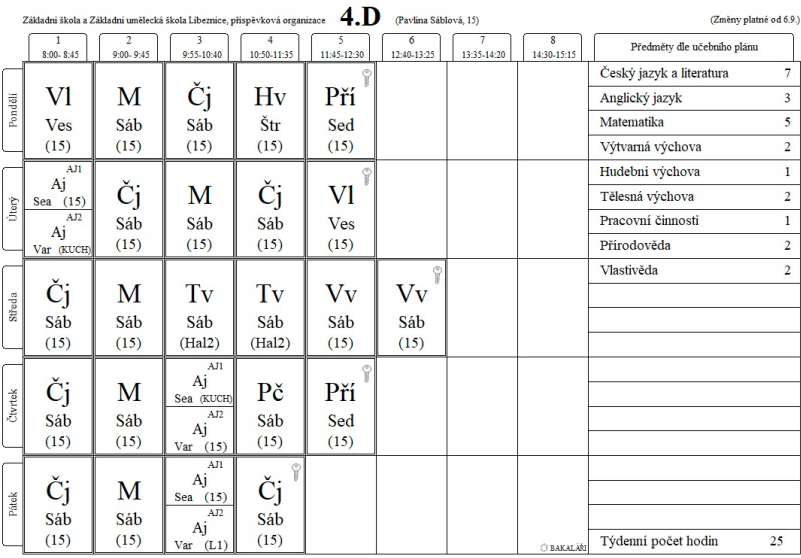 Rozvrh hodin třídy 4.D platný od 6.9.2021